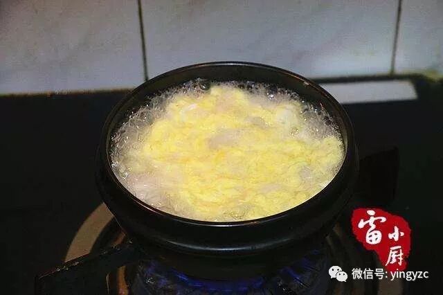 4、最后慢慢的淋入鸡蛋液就可以了,淋鸡蛋淋液时要慢慢转圈淋,做出来的蛋液才漂亮。做法很简单,赶紧煮来吃吧,冬天来一碗,全身都暖和呀。