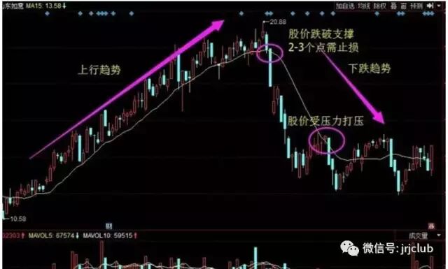 当股价处于上升通道时,下方15日均线(黄线)支撑着股价,每次触及都会反弹,个股趋势不变继续拉升。当股价在15日均线上方为支撑,股价跌破支撑后15日均线为压力。如图,股价在高位时跌破了支撑(高圈),股价趋势开始反转成为下跌趋势,股价随之也一落千丈。所以,股价跌破支撑2-3个点位时,必须要立即止盈止损!