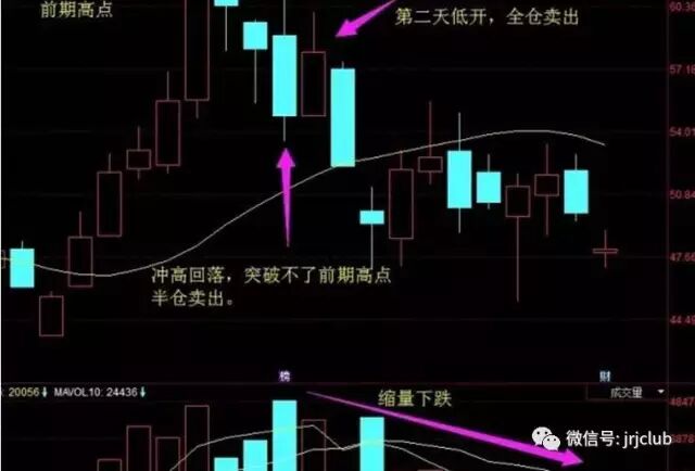 如图可以发现个股前期非常强势,一路收阳。这种强势股票,庄家筹码一般都比较低价,高位回吐获利概率非常大。在高位下跌调整时就要注意了,尤其是调整过程中,股价突然拉高突破前期高点,继而回落收长长的上影线时,需要半仓卖出,次日低开要果断止盈止损。
