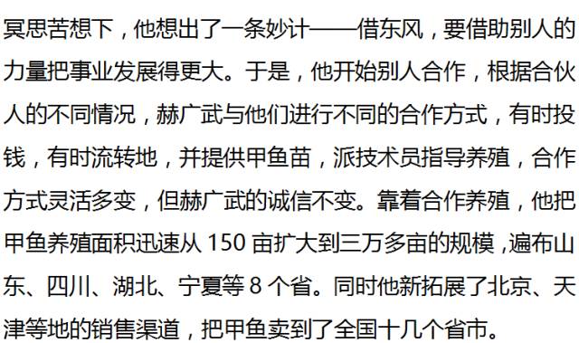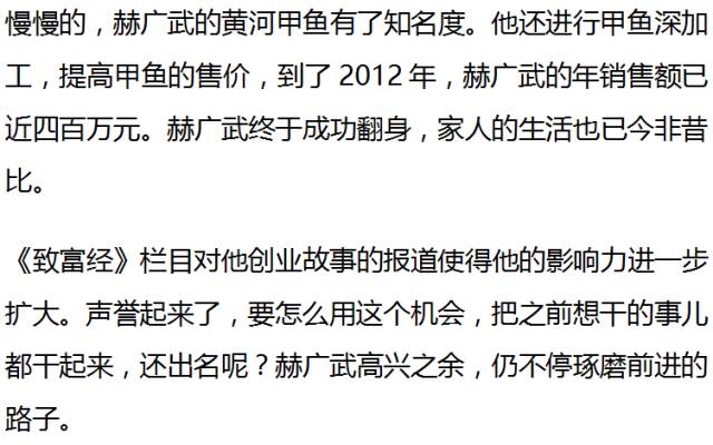 他喜欢被人叫老板,从小就想出名,为了这个名,他费尽心思,奋斗二十多年,终于,靠养甲鱼获得了成功。可在2012年,赫广武的年销售额还不到400万元,而现在,他涉足的甲鱼养殖总面积已超过三万亩,同时还发展了猪、羊、食用菌等多个致富项目,2016年他公司的年销售额超过1亿元!短短五年间,他是如何做到这么大的发展的呢?这么多年,他是如何奋斗,赚钱又出名呢?这一切,得从2004年的一天说起。