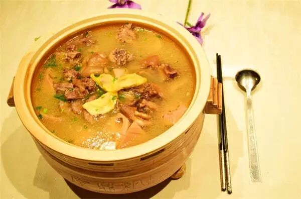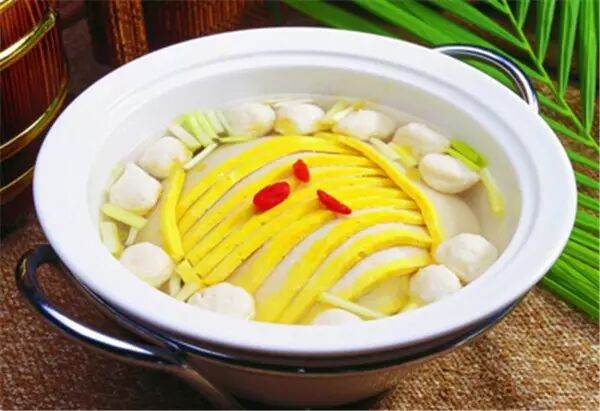 :,从前是艄公们的大烩菜,现在可是是宴席的压轴菜。使用的食材丰富:有土鸡、猪蹄、莲菜、红白萝卜、木耳、香菇、鸡蛋饺子、水发墨鱼和其他干货,而且,制作起来费时费工,正宗的做下来要4小时,味道自然不错。不过,这菜得人多着吃,一两个人可划不来哦。