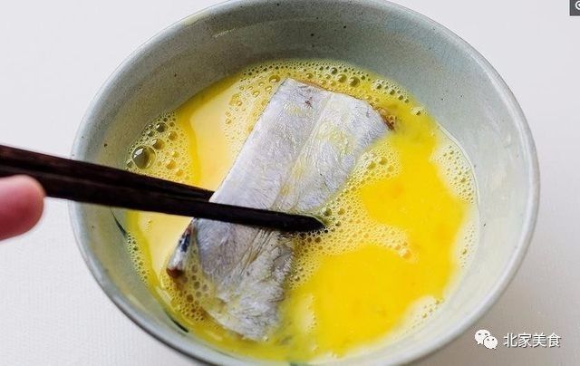 鸡蛋磕入碗里搅匀成蛋液。腌好的带鱼放进蛋液里裹匀蛋液。
