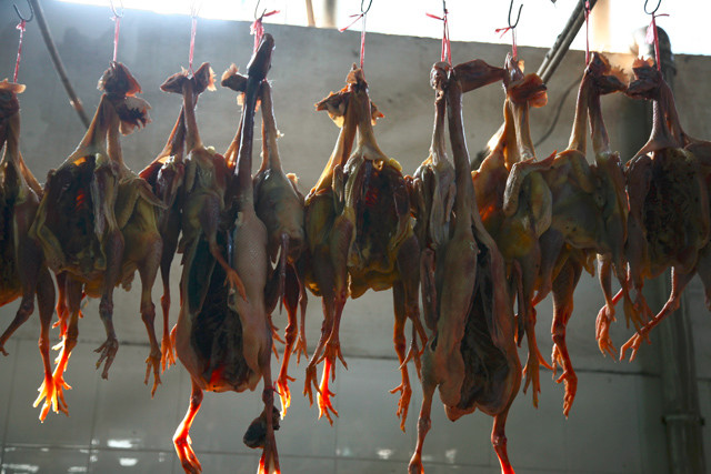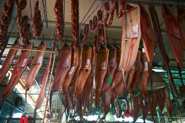 ▲市场上高高挂起的咸鸡、风鹅 摄影:英泽
