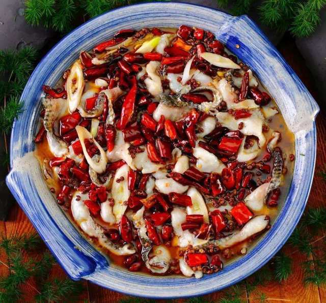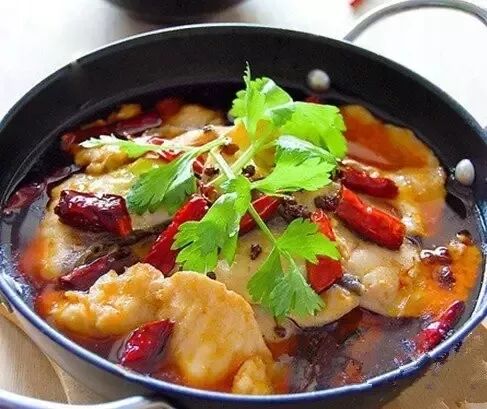 3.腌制好的鱼片用开水悼熟、捞出,将香红油烧至七成热,淋到焯好的鱼片上,撒上香菜即可。