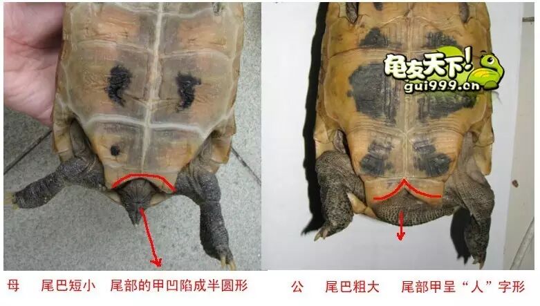 (2)公龟肛盾开口角度较大,母龟则相反。