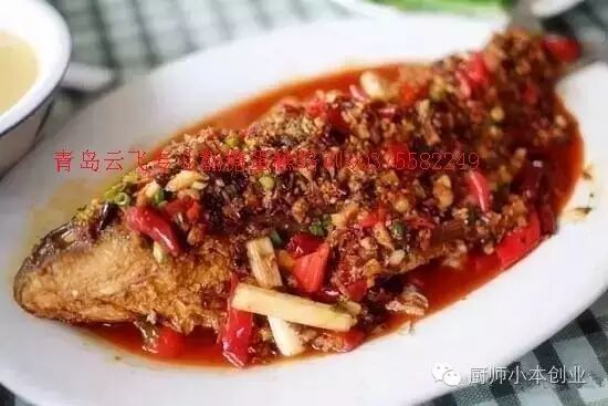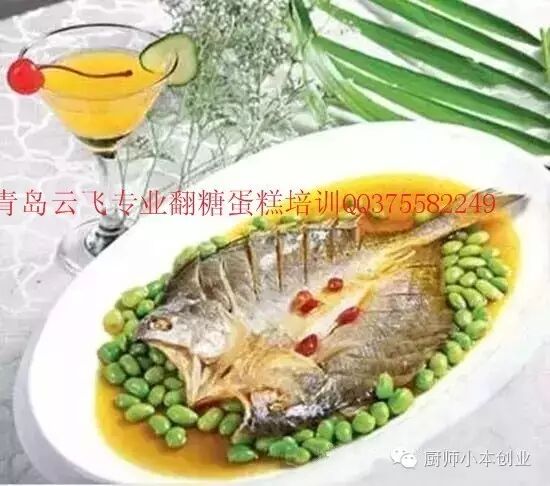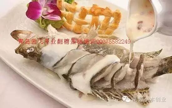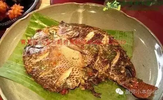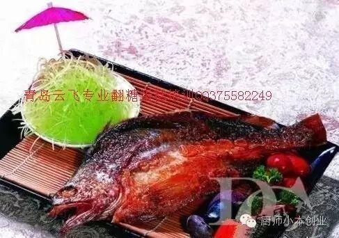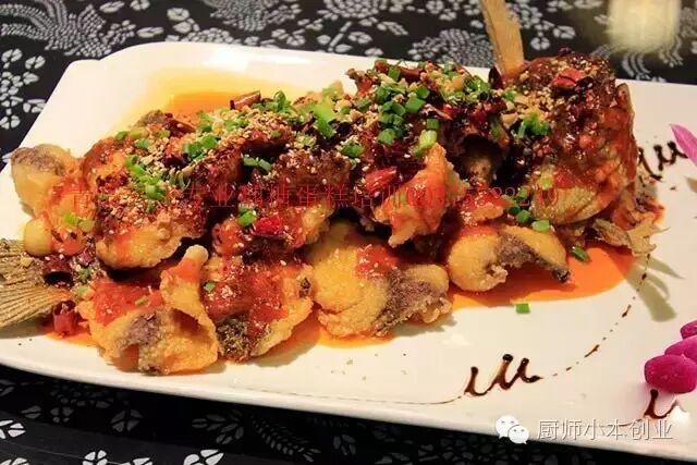 制作方法:草鱼去鳞从背脊开刀(方便去骨),去脊骨,改一字刀,加姜葱、 盐、料酒、胡椒码味2小时入味,入五成热油中小火浸炸3分钟至八成熟,再入烤箱烤8分钟,出锅装盘,淋入自制鱼汁,撒熟花生碎,配烤盘上桌即可。