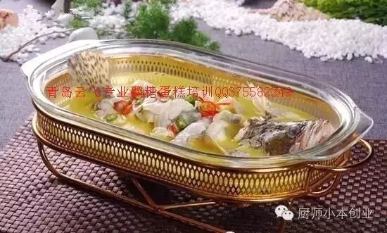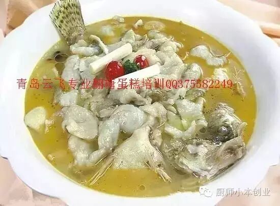 4、锅洗净,下入浓汤烧开,将腌好的鱼片汆过后盛于事先蒸好的水蛋底上,摆上蒸好桂鱼头尾。