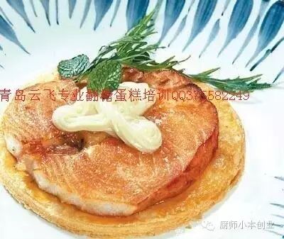 4、烤好的酥皮放 在盘中,上面放上洗净的生菜叶,将煎好的银鳕鱼放在上面,再将奇妙酱加柠檬汁、芥末调匀装入裱花袋中,将调好的奇妙酱挤在鳕鱼上,最后用薄荷叶装饰即成。