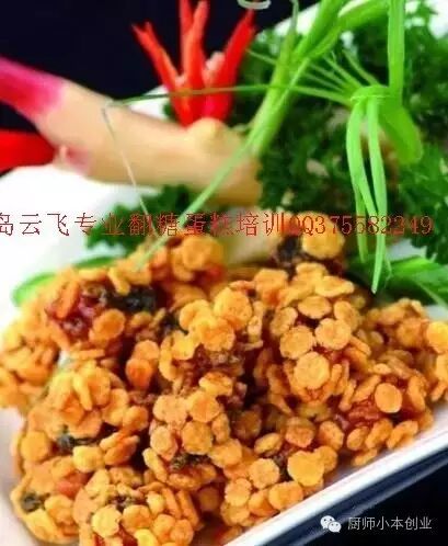 3、锅内留底油少许,下冰糖小火炒化且起泡后,离火下鱼丁拌匀糖 浆,起锅倒入托盘中的酥玉米片上,再不停地翻动,使鱼丁均匀地粘上酥玉米片,至冷却后装盘,稍加点缀即可。