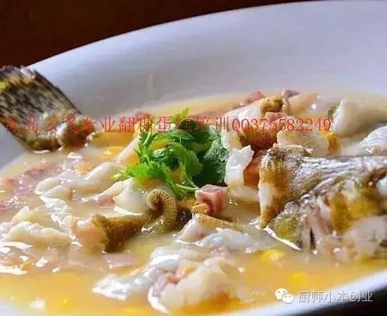 5、将蒸好的燕麦芋头玉米粒下入浓汤烧开,去浮沫,调味,勾芡后淋少许明油,出锅淋于鱼片上,点缀少许芫荽即可。