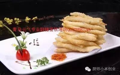 2、锅置火上,放油烧至四成热,将鱼排生坯逐一入锅小火炸至外酥内嫩、色泽金黄后出锅,改刀成条状装盘随味碟上桌即成。