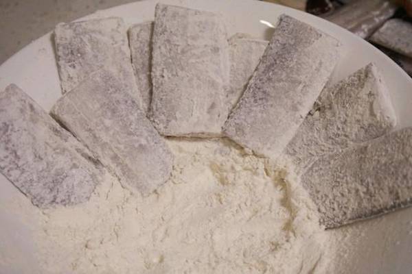 2、腌制好后就是油煎,一般咱们都会裹面粉,这里有几点小窍门: