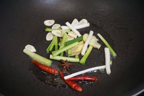 7、坐热锅子,少许油,放入葱白姜片蒜片爆香。