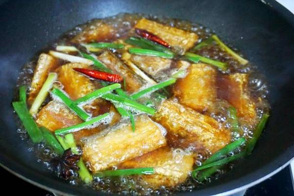 放入带鱼段,倒入调味汁。倒入没过带鱼的开水,放入葱绿,爱吃辣椒的放入几个辣椒。