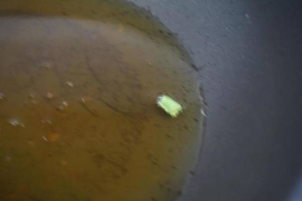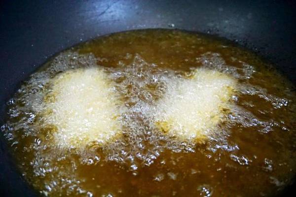 3、煎的时候,刚放进去的鱼段不要动,等5-6秒再轻轻推动,两面煎到金黄再捞出。带鱼段一定要炸头,不然一会儿红烧的时候,鱼肉很容易散。