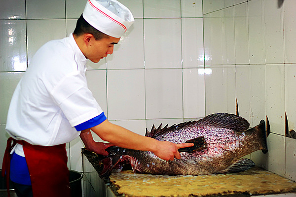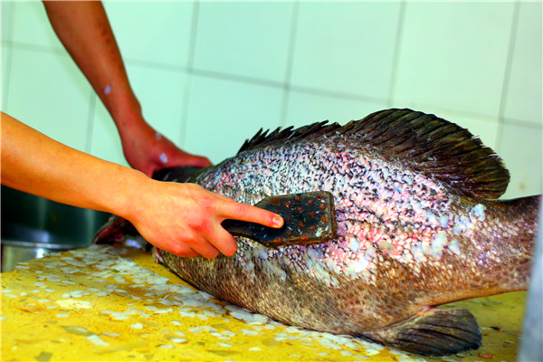 阿杰熟练的技艺使他面对硕大的石斑鱼时也可以如庖丁解牛般的得心应手。在丰富的经验指导之下,石斑鱼的各个部分被合理规划,并被阿杰重新组合。