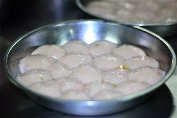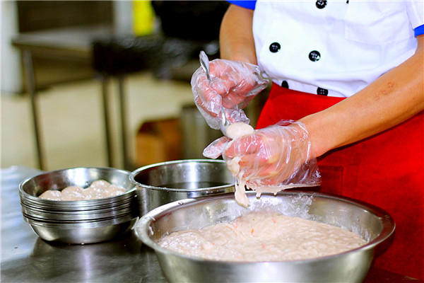 当完成这一步,接下来需要将鱼肉捶散,这也许就是“打鱼丸”名称的来历。在古汉语中,“打”包含很多的含义,其中就包括举手下落的一系列动作。这用在“打鱼丸”来说实在是再贴切不过。而这也决定了“打”下去时,必须有一定的力量,而且还要有一定的时间段,才能保证打出的鱼丸劲道凝结。同时,为了使鱼丸口感更加纯正鲜美、原汁原味,这里的鱼丸从来不加淀粉。