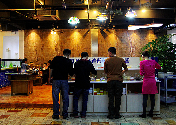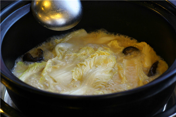 在正式开始就餐之前,蓝色渔火的服务员会为食客首先盛一碗浓白的锅底汤汁,无须夹杂任何调料,只要舌尖接触到那份鲜美,就会懂得近九个小时的熬制是多么有必要。