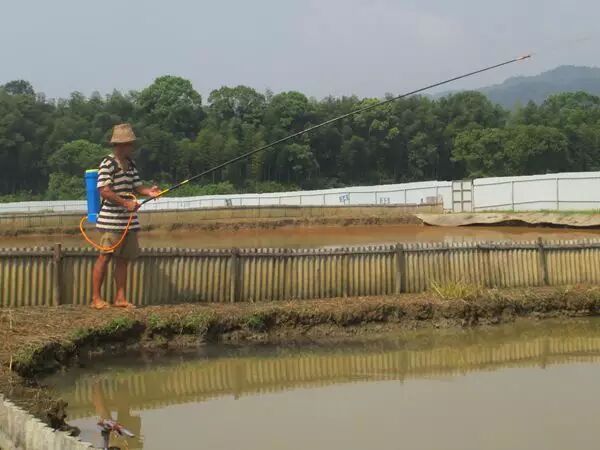 图为8月24日上午,养殖人员正在给池塘消毒