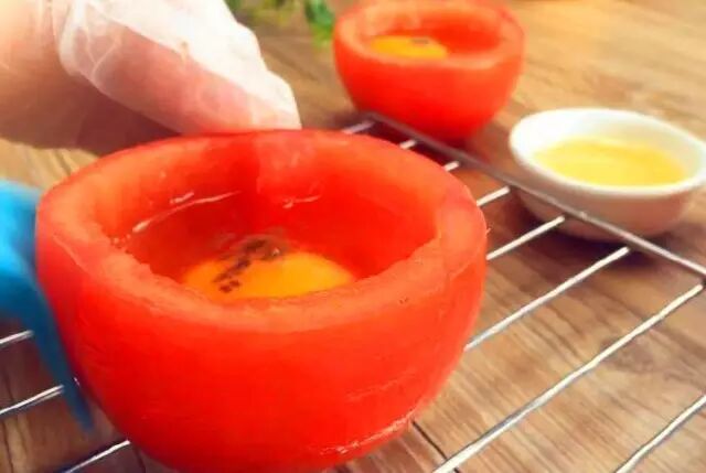 2、用小勺挖空番茄肉,要尽量保证外皮的完整性,不要把番茄壁挖的过薄。
