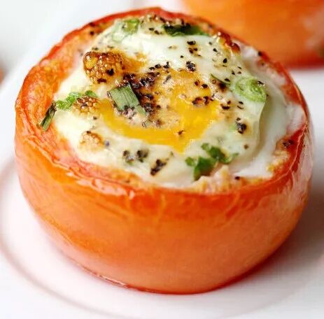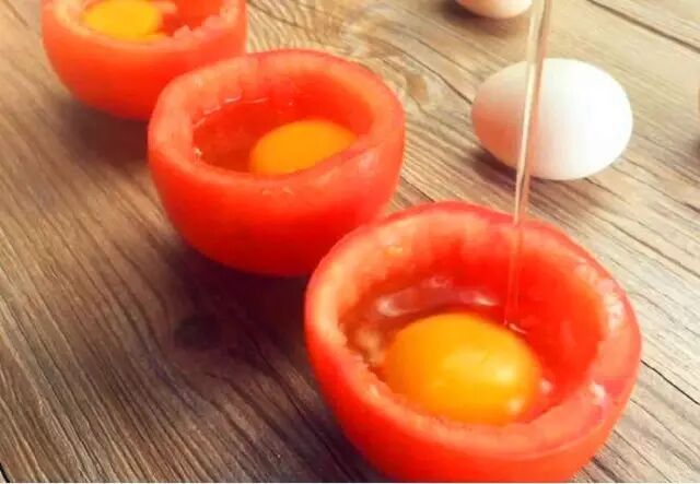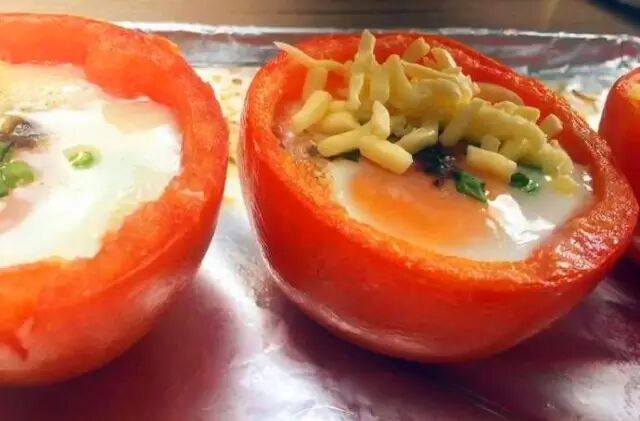 3、底部撒少量盐,每个番茄里打一个鸡蛋。
