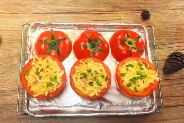 6、20分钟后,取出。很据个人口味撒上适量芝士,再入烤箱,同样温度,烤5分钟左右即可。