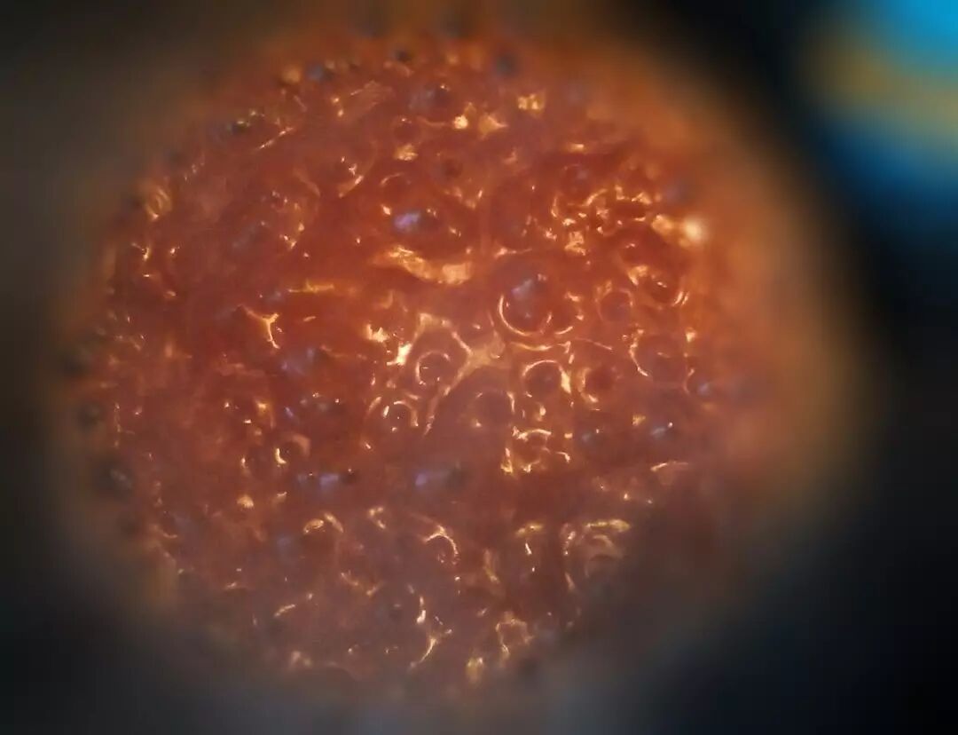 7、锅内留少量底油,把调好的汤汁倒入,放入一个西红柿,煮至浓稠,汤汁内有淀粉,易浓稠!