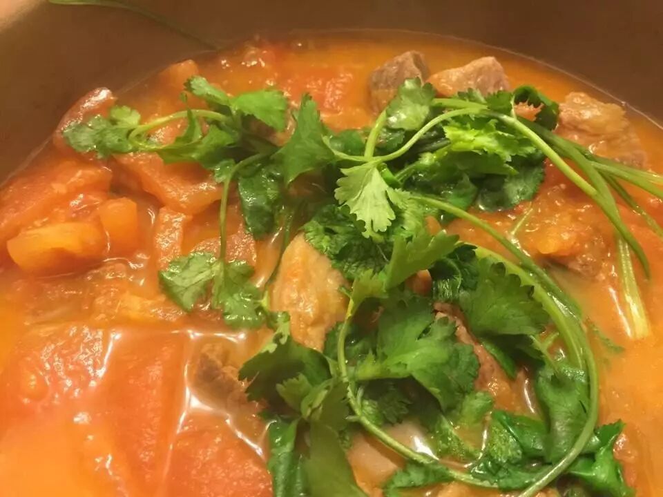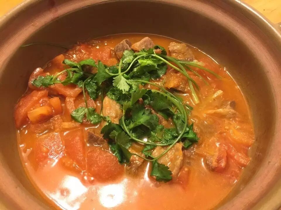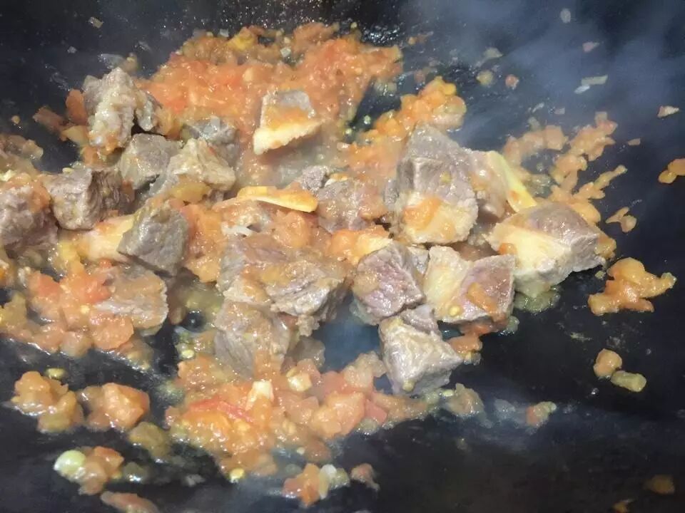 10、锅内加水,没过食材,老丁用的砂锅,也可以用高压锅,或者就是炒锅。加入盐调味,如果酸度不够,可以加入番茄酱。烧开后小火慢炖一个小时,然后加入大块西红柿,再炖半小时至牛肉软烂为止。