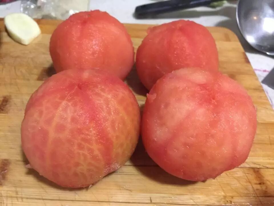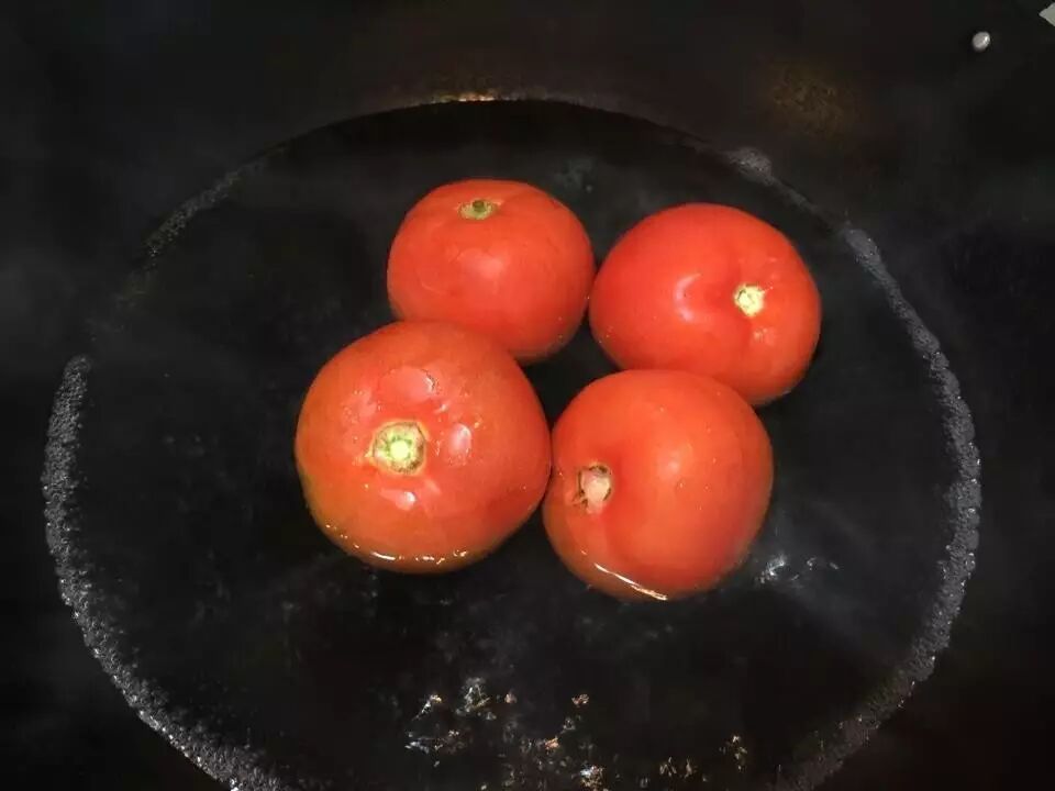 4、锅内烧开水,将西红柿头向下放入锅内,略煮。略煮的西红柿表皮会破解,方便剥皮。