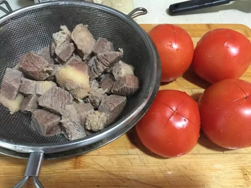 3、牛肉捞出备用,西红柿洗净,顶部切十字刀口。