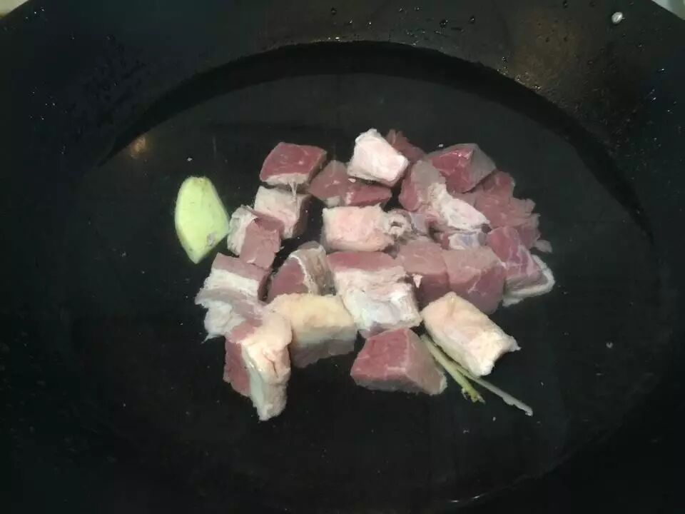 2、锅内放冷水,放入牛腩肉,下几片姜,一点料酒。烧开去浮沫。