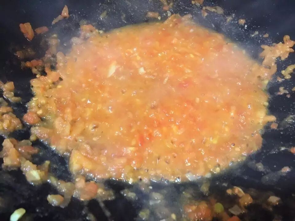 8、热锅凉油,葱姜爆锅出香味后加入西红柿小丁,用炒勺尽量压粘,加一点水,小火炒出酸味。