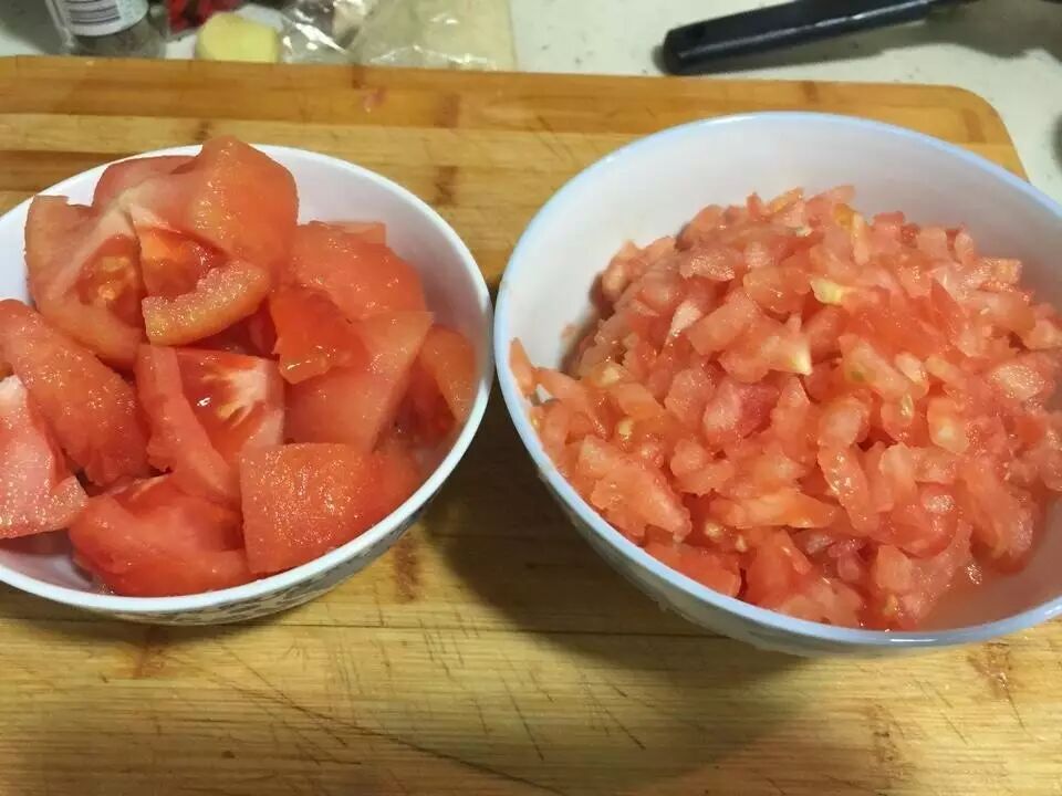 6、取两个西红柿切小丁,两个切大块。小丁的用来主要熬煮酸味。大块的用来最后吃。