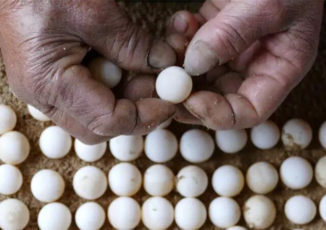 甲鱼蛋个头不大,直径只有2厘米,而且“脸皮”很薄,通透可人。生出的甲鱼蛋除了直接食用,更主要的有用途就是孵化小甲鱼~在沙箱中,保持32度的温度,85%左右的湿度,经过长达6周的等待,就能孵化出一元硬币大小的小甲鱼啦~