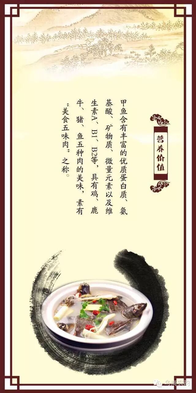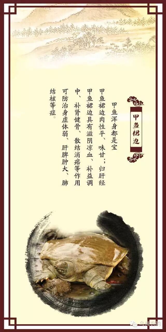 甲鱼(鳖)是餐桌上的大补之品,其周身均可食用,甲鱼裙、甲鱼肉、龟板胶等所有部位都有药用价值。