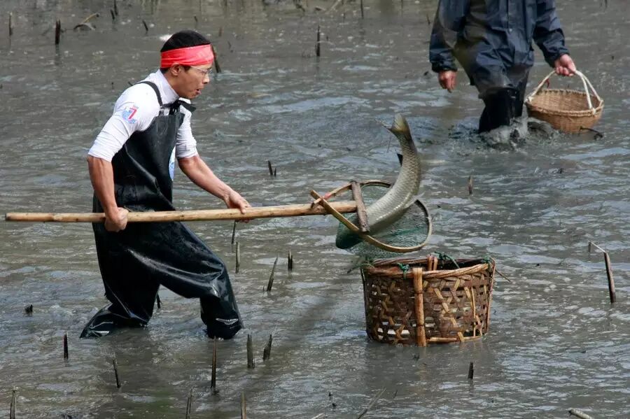 西溪湿地地貌独特,阡陌纵横的河网港汊交错成了上千个鱼鳞状鱼塘。西溪尤其是五常一带每年沿袭有干塘、吃鱼汤饭的习俗。干塘,简单地说就是把鱼塘的水放干,然后捉完鱼再清淤以备来年养鱼。随着塘水渐干,鱼、虾、蟹、泥鳅等挤在一起,蹦蹦跳跳,十分有趣。干塘节也是西溪湿地·洪园一年一度的传统项目。