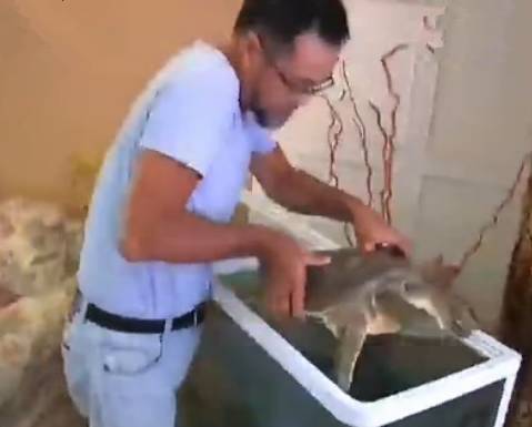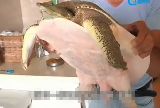 甲鱼太大,胡先生很艰难地把它从鱼缸里拿出来