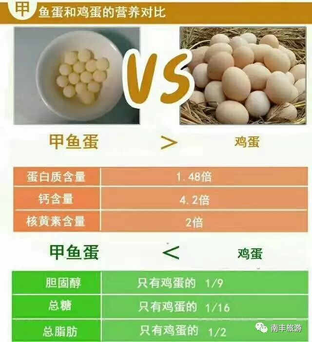 甲鱼蛋中蛋白质含量是鸡蛋的1.84倍,钙的含量是鸡蛋的4.2倍,核黄素是鸡蛋的2倍,对人体健康不利的胆固醇却只有鸡蛋的1/9,糖是鸡蛋的1/16,脂肪是鸡蛋的1/2,与鸡蛋相比,甲鱼蛋是一种高蛋白、高钙、低脂肪、低糖、低胆固醇的保健佳品,具有很高的营养价值。