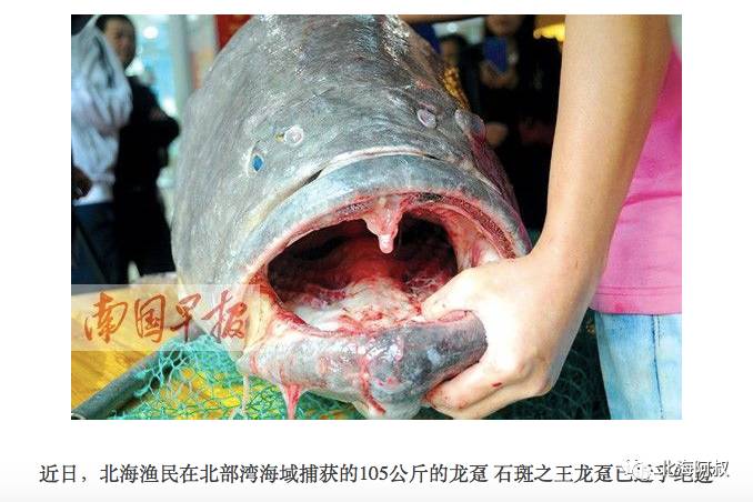 ●2013年11月,北海渔民在北部湾海域捕获105公斤的龙趸,被北海一家海鲜食府买下。