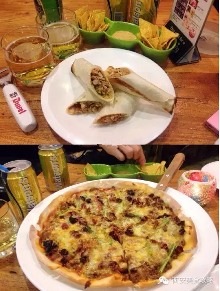 酒吧模式餐厅,气氛很好很喜欢,团购79双人套餐简直不要太划算,3瓶啤酒,小吃玉米片蘸酱,鸡肉手卷样貌平平味道比较惊艳,最后一道菜辣牛肉披萨,真正体现出墨西哥菜的灵魂很墨西哥人民对辣椒的喜爱,超薄的饼底厚厚的cheese满满一层牛肉上面洒满了干辣椒段,简直不要太重口