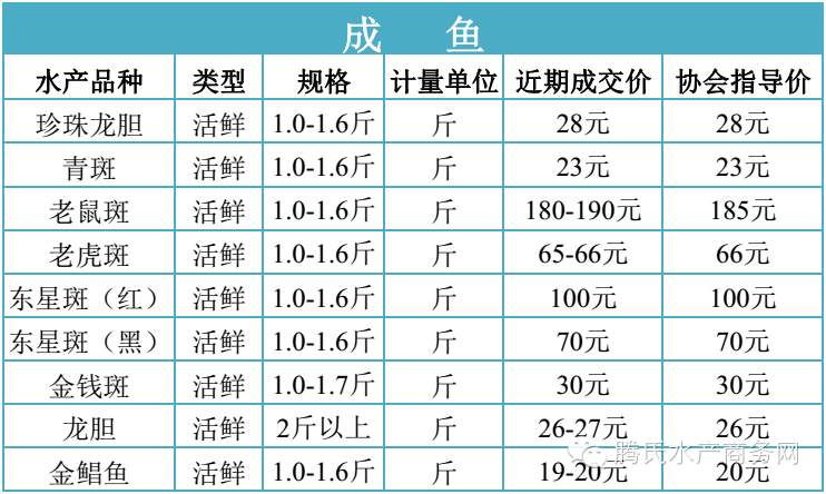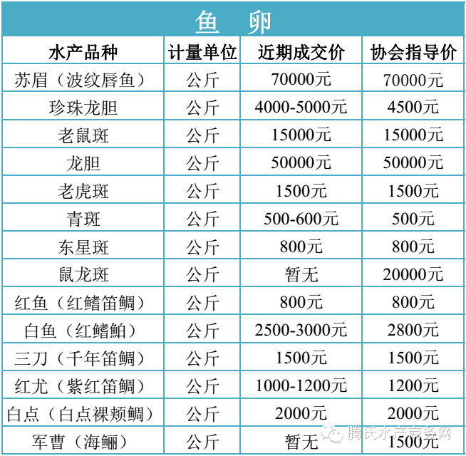 说明:苏眉卵暂无,六月初可能还会有;本周珍珠龙胆、老虎斑鱼卵有货,价格合适;青斑暂无,青斑市场认可度不高,价格一直在500元/公斤左右;东星斑、龙鼠斑(龙胆与老鼠斑的杂交)暂无。