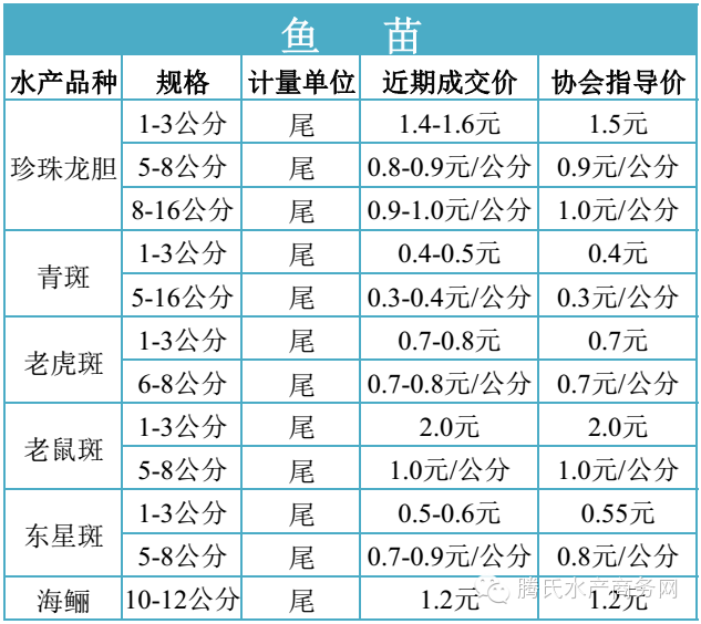 说明:近期海南岛南部气温升高,珍珠龙胆鱼卵孵化率低,所以1-3公分小苗价格回升,目前1.5元/尾左右,价格合适,建议买苗时要关注鱼苗的活力;有部分协会会员反应近期珍珠龙胆标粗成活率不高,故中苗价格稳定;珍珠龙胆鱼苗标粗至6、7公分可能会出现黑身病,故10公分上的鱼苗价格稍高。本周东星斑、老鼠斑、老虎斑鱼苗有货,东星斑小鱼养殖需求不大,价格较低,但其鱼苗成长较慢,中苗价格合理适中;老鼠斑的市场认知度高,但鱼苗成长很慢,小苗及中苗价格都较其它斑类高。金钱斑青斑、龙胆等鱼苗少有。