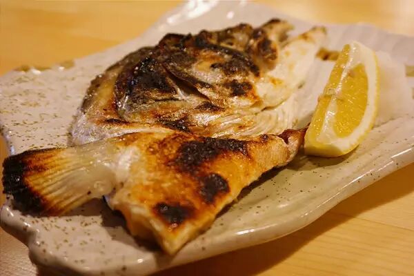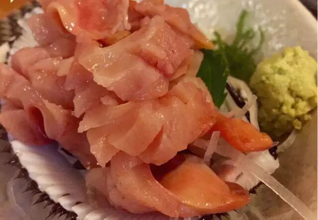 这里面积不大,装修也朴实无华。掀帘而入,这里和“深夜食堂”一样,有着昏黄的光线,陶质的碗碟,厚重的木质条形吧台,以及吧台前和老板、厨师相谈甚欢的熟客,还有各种家常的美味。颇有几分比萨混合章鱼烧风味的“荞麦烧”被盛放在圆形深碟中,配着小铲子,灵感来源于大阪烧或是广岛烧。#盐烤三文鱼头# 是我最喜欢吃的一道菜,鱼头已经被分成几小块,鱼皮烤的金黄,鱼骨松脆
