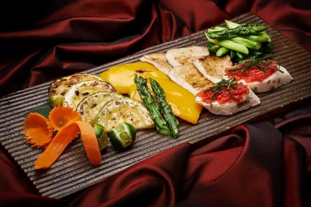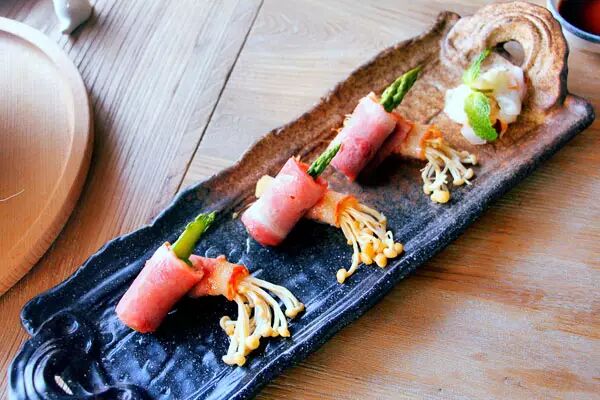 蜜烤多汁的鸡肉丸,现烤出炉,个头不大,一串三个,肉质鲜嫩,除了鸡肉本身的鲜甜之外,更有一种独特的醇香。再在表面沾上新鲜的生鸡蛋,其味无穷。现烤的番茄培根卷,让小番茄的清爽中和了培根的油腻,使得培根卷口感更鲜香味美,味蕾感动。三文鱼、北极贝、甜虾。三款料理排排搭,不仅颜值高,每一次咀嚼,都能感受到大海的馈赠。
