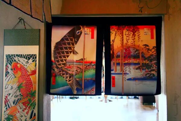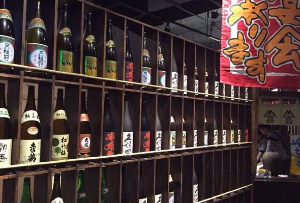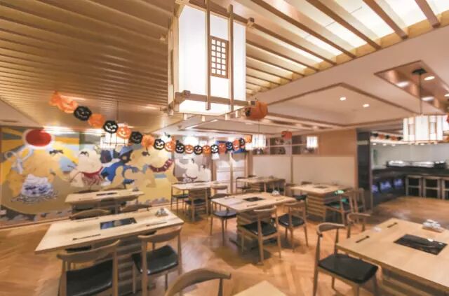 大隐隐于市,就是在说大喜。在繁华的武林路上,大喜居酒屋成为一个独特的存在,古朴的门面、淡雅的灯光透出最本真的日式风味。一推门,你就会看到扑面而来的彩色墙绘,画的正是日本的国鱼“锦鲤”,这是老板特意请中国美院的油画老师绘制的。另一侧墙壁以金银色间隔的竹编装饰,调性十足。