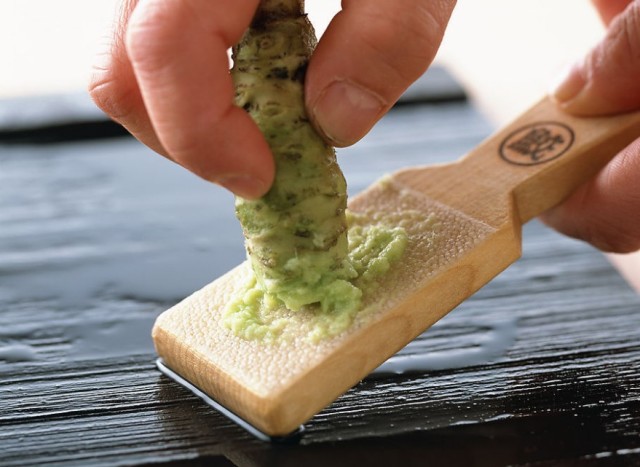 既然叫“山葵家”,这里的山葵一定可以现磨成芥末。如果你不吃芥末,或是从来没看过山葵变成芥末的过程,那就别轻易标榜自己是日料老饕啦。追求食材品质的山葵家采用新鲜山葵。山葵这种傲娇的植物长在日本的瀑布或山泉之下,只接受清水的洗礼,是一种极天然、极干净的食物。真正充当日料灵魂佐料的Wasabi,其实应该是山葵。它外形有点像莴笋,通体碧绿,上面分布着黑色的凹点。