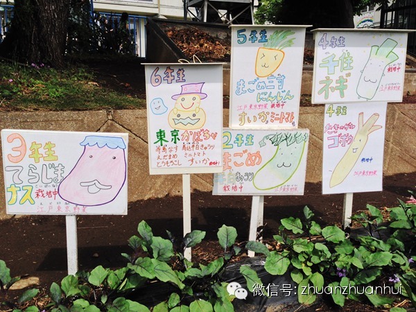 四年前他开始与各个学科的老师推动校园菜园。理科可以观察作物的生长变化,家事课可以拿菜园的菜来料理。松丸经常趁小朋友还没来的时候帮忙浇水、管理,田里的充满童趣的广告牌竟是松丸一张张亲手画的。