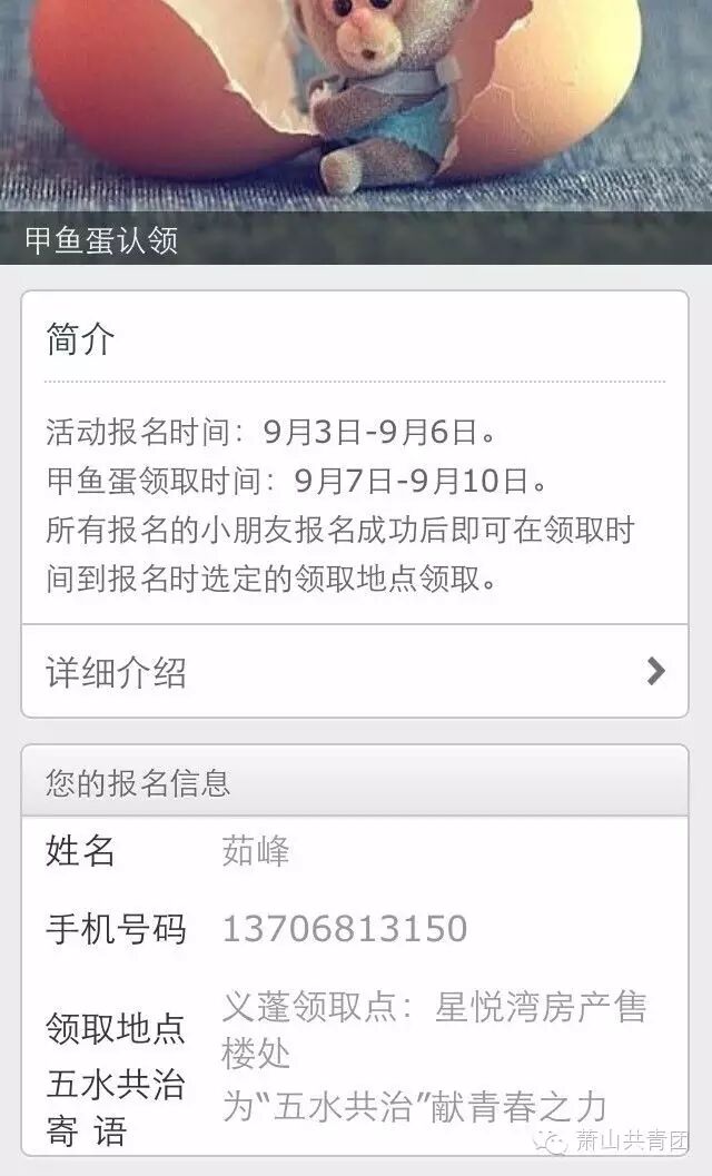 凭微信领取。请您向领取地点的工作人员展示“萧山”微信公众号“青百宝箱-甲鱼蛋认领”中“您的报名信息”,经工作人员核对确认后,就可以领取了。例如下图: