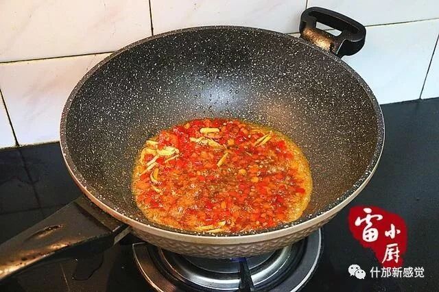 2、热锅凉油,放生姜,大蒜,剁椒酱一起小火煸炒出香味。剁椒酱一定要选炒过之后再码在鱼上面去蒸,别小看这个步骤,做出来的鱼会更香哦。