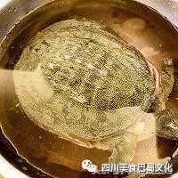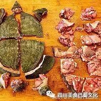 甲鱼去老皮:从龟壳上倒沸水下去没过甲鱼,浸烫两分钟后捞出,这时间刚好能烫的老皮一撕即下但龟肉不会烫熟,用手搓几下就可以把老皮搓起撕掉。腹背四爪头尾都撕干净。老皮必须去除才能烹饪,要不然又腥又臭。